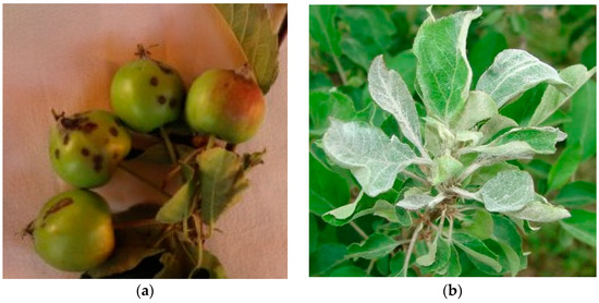 Representative symptoms of apple scab on fruit (a) and representative symptoms of powdery mildew on shoot (b). Photos by I.J. Holb.