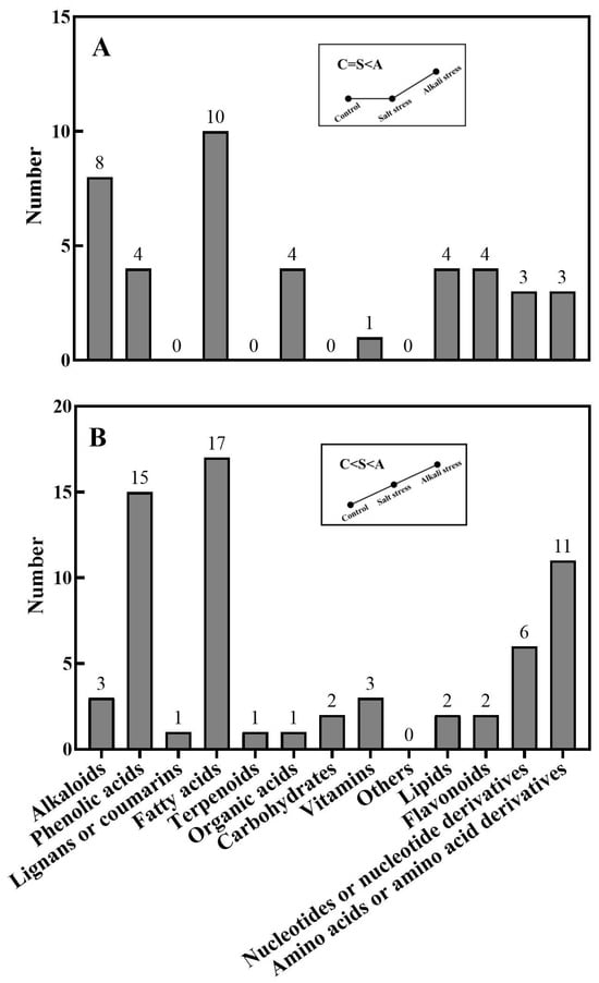 Alkali stress-induced accumulated metabolites in wheat roots. The number of metabolites in each type is displayed. (A) Control and salt-stressed plants showed similar levels for each metabolite, with lower levels than those in alkali-stressed plants; (B) alkali-stressed plants > salt-stressed plants > control plants in levels of metabolites. The 30-day-old wheat seedlings were treated with salt stress (88 mM Na+ and pH 6.7) and alkali stress (88 mM Na+ and pH 8.8) solutions for 3 days. Three biological replicates were used for each treatment.
