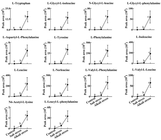 Comparative effects of salt and alkali stresses on the secretion of amino acids and amino acid derivatives in wheat plants. Alkali stress-induced secreted amino acids or amino acid derivatives are displayed. The 30-day-old wheat seedlings were treated with salt stress (88 mM Na+ and pH 6.7) and alkali stress (88 mM Na+ and pH 8.8) solutions for 3 days. Three biological replicates were used for each treatment. Different letters above the bar indicate significant differences.