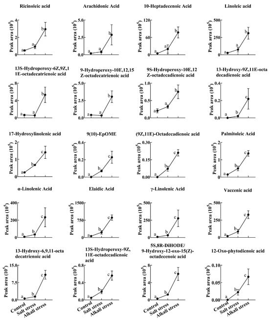 Comparative effects of salt and alkali stresses on the secretion of unsaturated fatty acids in wheat plants. Alkali stress-induced secreted unsaturated fatty acids are displayed. The 30-day-old wheat seedlings were treated with salt (88 mM Na+ and pH 6.7) and alkali (88 mM Na+ and pH 8.8) solutions for 3 days. Three biological replicates were used for each treatment. Different letters above the bar indicate significant differences.