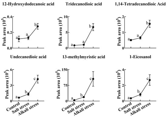 Comparative effects of salt and alkali stresses on the secretion of saturated fatty acids in wheat plants. Alkali stress-induced secreted saturated fatty acids are displayed. The 30-day-old wheat seedlings were treated with salt stress (88 mM Na+ and pH 6.7) and alkali stress (88 mM Na+ and pH 8.8) solutions for 3 days. Three biological replicates were used for each treatment. Different letters above the bar indicate significant differences.