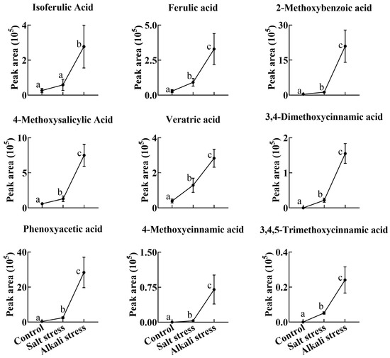 Comparative effects of salt and alkali stresses on the secretion of phenolic acids with a –COOH group in wheat plants. Alkali stress-induced secreted phenolic acids are displayed. The 30-day-old wheat seedlings were treated with salt stress (88 mM Na+ and pH 6.7) and alkali stress (88 mM Na+ and pH 8.8) solutions for 3 days. Three biological replicates were used for each treatment. Different letters above the bar indicate significant differences.