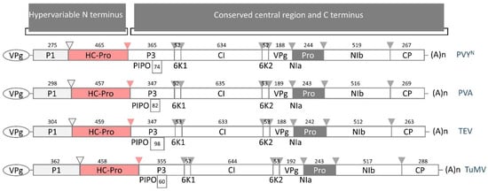 Schematic diagram of the genomic organization of four potyviruses, which encode 11 putative proteins. Potyvirus 1 (P1) is involved in the translation and modulation of replication. The multifunctional Helper-Component protease (HC-Pro) is discussed in this review. Potyvirus 3 (P3) participates in virus replication. The N-terminal half of P3, fused to the Pretty Interesting Potyvirus open reading frame (P3N/PIPO), facilitates cell-to-cell movement. The 6-kiloDalton protein 1 (6K1) forms replication vesicles. Cylindrical Inclusion (CI) functions as an RNA helicase. 6K2 is the 6-kiloDalton protein 2. The viral genome-linked protein (VPg) is involved in translation, virus movement, and replication. The Nuclear Inclusion a protease (NIa-Pro) cleaves polyproteins at seven sites. Nuclear Inclusion b (NIb) is an RNA-dependent RNA polymerase. The coat protein (CP) participates in virus movement, virion formation, and aphid transmission. Across the Potyviridae family, the N-terminal regions are defined as hypervariable termini due to differences in protein organization and size, whereas regions from P3 to CP are relatively conserved, with some exceptions, as mentioned above []. The number above each box expresses the size of the amino acid sequence of the corresponding protein (as presented in []). Cleavage sites are indicated with arrows (HC-Pro: red, P1: light gray, NIa: gray). PVYN—necrotic strain of potato virus Y (GenBank Accession No.: UVJ64998), PVA—potato virus A (GenBank Accession No.: QYA72248), TEV—tobacco etch virus (GenBank Accession No.: UTQ11696), TuMV—turnip mosaic virus (GenBank Accession No.: WIM35122).
