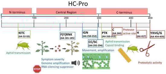 Several amino acids with the CC/SC sequence motif (Figure 2) in the central region of HC-Pro have been implicated in long-distance movement and genome amplification [,]. However, more recent studies have shown that HC-Pro is correlated with RNA silencing suppression. For this reason, the role of the amino acid motif in transport may be misleading [].