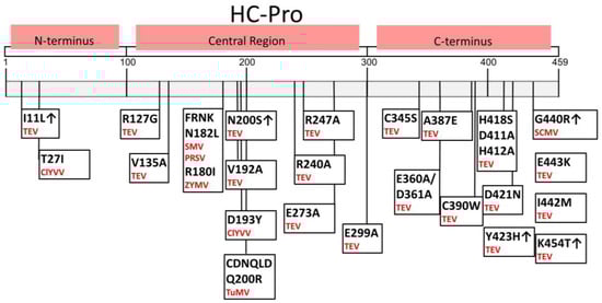 Amino acid sequences of HC-Pro crucial for gene silencing suppression and symptom development, identified using HC-Pro mutants (changed AAs and positions are indicated). Particular viruses are in red; ↑ indicates increased suppressor activity; no symbol indicates hypo- or null suppression activity after a particular change [,,,,,,,,].