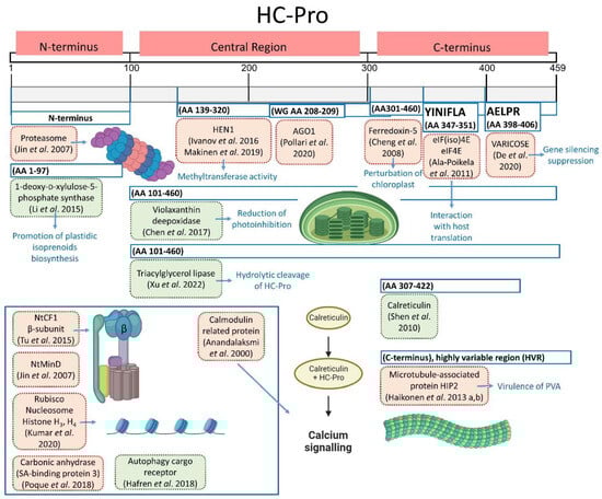In this context, this review aimed to compile the amino acid sequences or motifs responsible for specific HC-Pro functions across potyvirus species and to gather the up-to-date known interaction partners of HC-Pro in host cells, discussing the implications of such interactions. In addition, we analyzed putative host proteins carrying an HC-Pro cleavage sequence. As such, this review may help us to better understand the role of proteases in infected plant host cells.