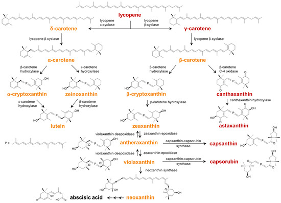 Main routes for biosynthesis of carotenoids [1]. Names are in yellow for “yellow carotenoids” (λmax < 460 nm) and are in red for “red carotenoids” (λmax > 470 nm). Also, see the text for definitions.