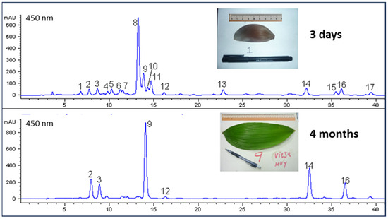 The carotenoid composition was investigated by HPLC-DAD analysis of the saponified extracts in all stages. In Figure 3, it can be seen that, in the early collected leaflets (3 days), the main carotenoid was capsorubin, but otherwise they were mainly characterized by some other κ-carotenoids, such as capsanthin and their isomers. These are the red carotenoids, the carotenoids with a κ-end group (peaks 4, 5, 8, 11, 13), which possess a higher absorption maxima (λmax > 470 nm) than the yellow carotenoids (λmax < 460 nm) from the chloroplasts (main peaks 2, 3, 9, 14, 16).
