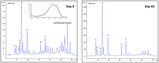 The esterification or non-esterification of the carotenoids may also possess important background information about whereabouts of the carotenoids in the leaflets; thus, the unsaponified extracts were also studied. Figure 4 shows that, at the beginning (t = 0), carotenoid esters (unnumbered peaks with high retention times) predominate, but they decrease during development (43 days).
