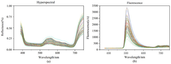 The fluorescence spectrums contained 125 spectral bands ranging in wavelength from 376.80 nm to 1011.05 nm. This wavelength range is green light (wavelength 500–560 nm), which is mainly absorbed by chlorophyll. The studies were carried out with a 495 nm fluorescence filter, and after passing through the excitation filter at 390 nm, the resulting fluorescence spectrum pictures revealed obvious wave peaking at about 510 nm, as well as inconspicuous wave peaking at around 690 nm and 740 nm. Varied samples contain varied chlorophyll contents in the hyperspectral and fluorescence spectra, resulting in variances in the spectral curves.
