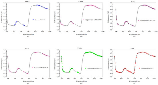 Hyperspectral feature band map created using various feature extraction algorithms: (a) BOSS; (b) CARS; (c) IVSO; (d) MASS; (e) IVISSA; and (f) UVE.