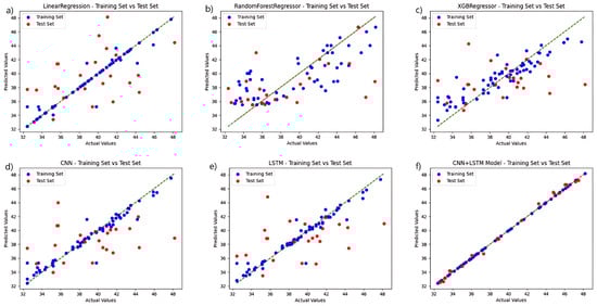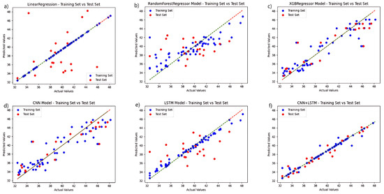Comparison of the prediction functions of six models in the same fluorescence spectral feature band: (a) LinearRegression; (b) RandomForestRegressor; (c) XGBRegressor; (d) CNN; (e) LSTM; and (f) CNN+LSTM.