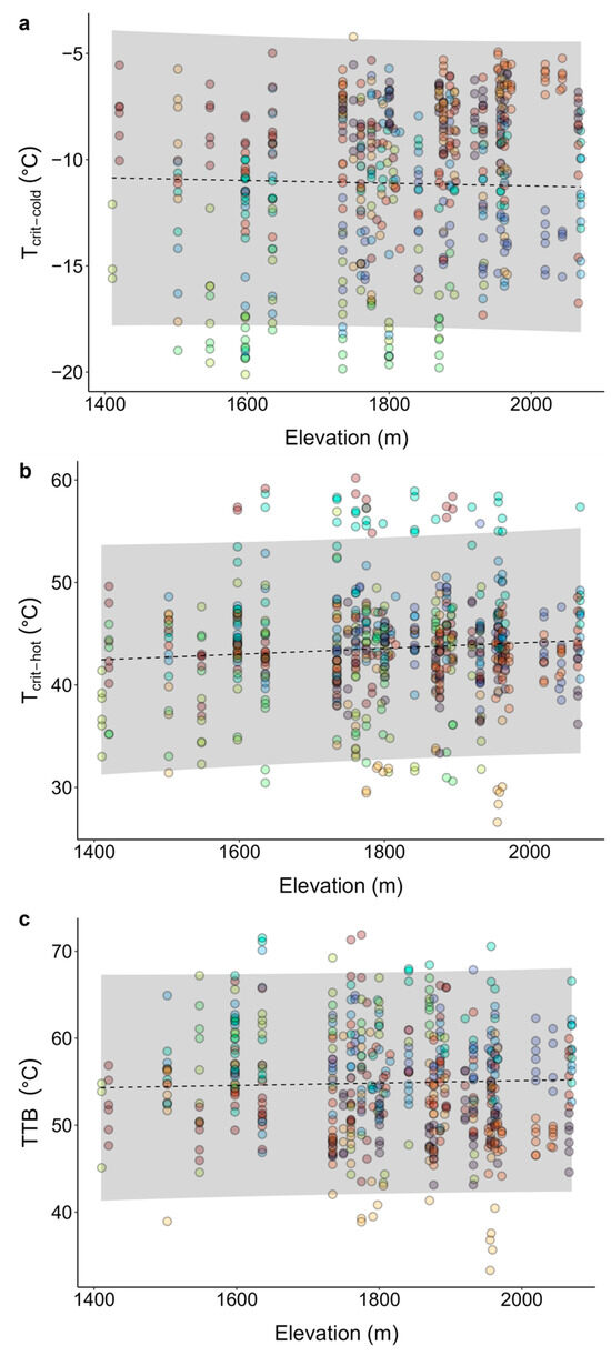 Linear mixed models were used to determine the relationship between elevation and thermal tolerance thresholds (Tcrit-cold, Tcrit-hot, and TTB) with consideration of species-specific responses. Two families of models were examined. The first family had the fixed explanatory variable as elevation (continuous) and species as a random effect (categorical, 10 levels). The random effect of species was included in the models as thermal thresholds are known to vary intra- [87,88] and interspecifically [20,89], and species-level variation was of interest a priori (see Table S3 for model fitting). The Tcrit-cold model included the date of sampling (categorical, 8 levels) as an additional random effect and the Tcrit-hot model included site (categorical, 17 levels) as an additional random effect. The TTB model included only species as a random effect based on the best fit. For these models, both random intercepts and random slopes for elevation within each level of species were fitted. In the end, random slopes were excluded from models as the variance accounted for by species-specific slopes across elevation was effectively zero, leading to singularity issues for the models.