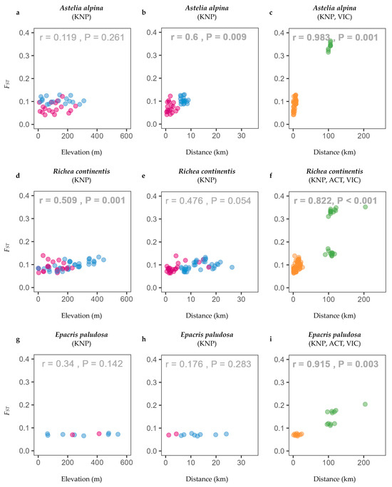 Isolation-by-distance plots comparing genetic differentiation (FST) of alpine plant species across (a,d,g) elevation and (b,e,h) geographic distance in Kosciuszko National Park (KNP) and (c,f,i) across south-eastern Australia. Three example species are shown here: (a–c) Astelia alpina, (d–f) Richea continentis, and (g–i) Epacris paludosa (refer to Figure S2 for the results of all study species). For the plots in the left and middle panels, the coloured symbols represent within- and between-transect pairwise comparisons of sites (pink for within transects and blue for between transects). The study transects are Charlotte Pass, Perisher, and Thredbo. For the plots in the right panel, the coloured symbols represent within- and between-region pairwise comparisons of sites (orange for within regions and green for between regions). The study regions are Namadgi, ACT, Kosciuszko National Park, NSW, and Alpine National Park, VIC.