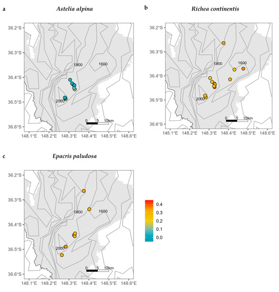 Within-population inbreeding (Fis) of alpine plant species within Kosciuszko National Park, NSW. Three example species are shown here: (a) Astelia alpina, (b) Richea continentis, and (c) Epacris paludosa. Colours of circles indicate increasing Fis. Figure S4 includes Fis within Kosciuszko National Park as well as across south-eastern Australia for all ten species. The grey area represents the boundary of Kosciuszko National Park. The grey contour lines represent elevation with intervals of 200 m.