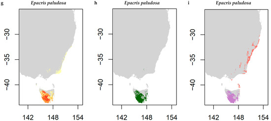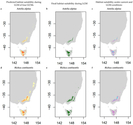 By overlaying predictions of four global climate models (GCMs) and retaining areas where 50% of GCMs agreed on habitat suitability (Figure 4a,d,g), the suitable habitat during the last glacial maximum was 30,864 km2 for Astelia alpina, 50,318 km2 for Richea continentis, and 54,679 km2 for Epacris paludosa (Figure 4b,e,h). For the three focal species, SDMs predicted a loss in suitable habitat over time with contraction since the LGM, with values of 80% for A. alpina, 90% for R. continentis, and 26% for Epacris paludosa (Figure 4c,f,i). During the LGM, both A. alpina and R. continentis exhibited broader potential distributions, as described here by habitat suitability, across south-east Australia and Tasmania, with some fragmentation across this range, whilst E. paludosa was mostly distributed in Tasmania during this period. For A. alpina and R. continentis, suitable habitat decreased over time, but the location of the continuous distributional area of each species did not shift strongly, except that R. continentis did not remain in Tasmania. Both species exhibit relatively comparable land coverage where the habitat suitability of the LGM and current potential distributions overlap, hereafter referred to as temporally stable habitat. Astelia alpina was predicted to have 5411 km2 of temporally stable habitat and R. continentis was predicted to have 4607 km2 of temporally stable habitat (Figure 4c,f). On mainland Australia, Richea continentis has a larger area of temporally stable habitat than A. alpina, which is also distributed in Tasmania. On the other hand, the potential distributional area of E. paludosa largely shifted between the LGM and now. During the LGM, models predicted that E. paludosa was extant in Tasmania and small areas of mainland Australia near the Victorian Alps. The current distribution of E. paludosa is fragmented across the south-east of the mainland, Flinders Island (between the mainland and Tasmania), and in small areas in northern parts of Tasmania. Due to the northward shift in the distribution of E. paludosa, there are only small areas (414 km2) of temporally stable habitat in northern Tasmania and the Victorian Alps (Figure 4i).