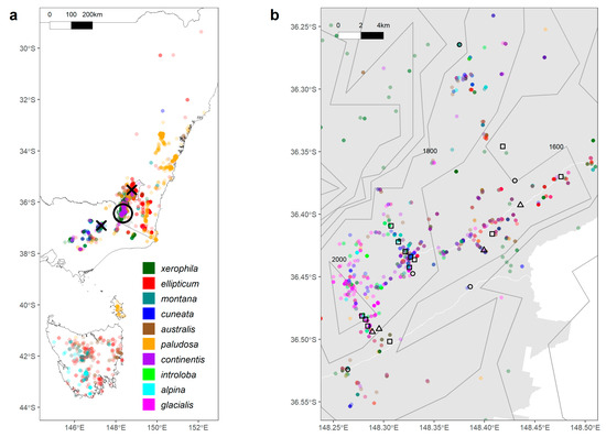 Maps showing the distributional and sampling range of ten alpine plant species across south-eastern Australia (a) and within Kosciuszko National Park (b). Refer to Table 3 for the full species list. Each coloured point represents cleaned floristic data sourced from Atlas of Living Australia [69], where different colours represent species. On the regional scale (a), the circle shows the approximate range of sampling across Kosciuszko National Park and crosses represent sites in Namadgi National Park, Australian Capital Territory (northern cross), and Alpine National Park, Victoria (southern cross). Within Kosciuszko National Park (b), symbols represent sample collection types: squares indicate sites where both genetic and physiological samples were collected, circles indicate sites where only genetic samples were collected, and triangles indicate where only physiological samples were collected. The grey area represents the boundary of Kosciuszko National Park (b), and the black borders on each map represent state boundaries for the Australian Capital Territory (ACT), New South Wales (NSW), and Victoria (VIC). Grey contour lines represent elevation with intervals of 200 m.