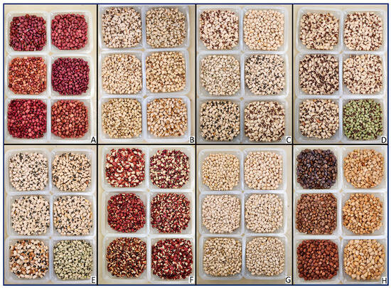 The visual examination of seed coat color/pattern was conducted every year from 2014 to 2020 in two locations. Phenotypic data for each accession in the observed populations can be found in Supplementary Table S1. The classification of accessions revealed that 21 were characterized by the Red (full coat), 102 as the White coat, 82 as the Tan/Brown coat, 36 as the Blackeye, 27 as the Pinkeye, 45 as the Browneye, 20 as the Cream (full coat), and 24 as the Red/Brown Holstein.