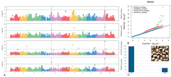 (A) The Manhattan plots of four GWAS models (from top to the bottom) for the Pinkeye pattern: MLM, MLMM, FarmCPU), and BLINK. The green transverse line of each model is the mark of significance threshold (−log(P) ≥ 6.34). The gray vertical lines mark the significant loci across multi-models. (B) The QQ plots of four models: MLM (red), MLMM (yellow) FarmCPU (green) and BLINK (blue). (C) The distribution of the Pinkeye pattern seeds in the mapping panel, y-axis = counts of the accessions, x-axis: value assignment of seed coat/pattern (Pinkeye = 9, non-Pinkeye excluded Brown/Red Holstein/eye and Red seed = 1).