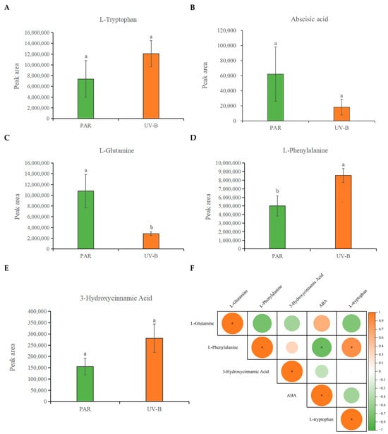 After UV-B radiation exposure, R. chrysanthum’s ABA and key metabolites act together. (A–E) Bar graphs representing the changes in L-tryptophan, ABA, L-glutamine, L-phenylalanine, and 3-hydroxycinnamic acid after UV-B radiation exposure, respectively. The peak area is used to estimate the relative amount of a specific metabolite in a sample. The larger the peak area, the higher the amount of that metabolite in the sample. The three biological duplicate experiments’ means are shown by the heights of the bar graphs (n = 3), and the SDs of the three samples are shown by the error bars. Significant changes across data groups are indicated by different letter markers (p < 0.05). (F) Correlation analysis between key substances in R. chrysanthum under UV-B radiation. Correlation analyses were performed on the data involved for each metabolite in (A–E). Orange and green circles represent positive and negative correlations, respectively, and the sizes and color shades of the circles indicate the strength of the correlation, with “*” representing r2 ≥ 0.8 and p < 0.05. (G) Mechanogram of changes in ABA and key metabolites in R. chrysanthum after UV-B radiation exposure. Orange bi-directional arrows represent positive correlations, and green bi-directional arrows represent negative correlations.