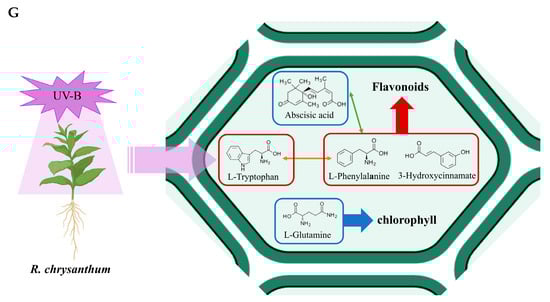 UV-B radiation resulted in an increase in L-tryptophan content and a decrease in ABA content in R. chrysanthum, and the differences in these changes were not significant (Figure 1A,B). L-tryptophan is able to participate in the signaling process of plants in response to UV-B stress, and the increase in its content due to UV-B radiation indicates that R. chrysanthum switched on a response mechanism upon exposure to UV-B radiation. L-glutamine is associated with photosynthetic pigments, and UV-B caused a decrease in its content, suggesting that UV-B can have some effect on the photosynthetic system of R. chrysanthum, which is consistent with the aforementioned results, indicating that UV-B can disrupt the photosynthetic system of R. chrysanthum (Figure 1C).