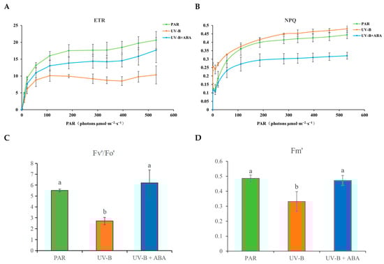 Dynamics of R. chrysanthum’s chlorophyll fluorescence characteristics. (A,B) Line plots of NPQ and ETR in R. chrysanthum after exogenous ABA and UV-B radiation treatments. (C,D) Histograms of Fv′/Fo′ (variable fluorescence ratio in the light) and Fm′ (maximum fluorescence in the light) of PSII of R. chrysanthum after treatment with exogenous ABA and UV-B radiation. The three biological duplicate experiments’ means are shown by the heights of the bar graphs (n = 3), and the SDs of the three samples are shown by the error bars. Significant changes across data groups are indicated by different letter markers (p < 0.05).