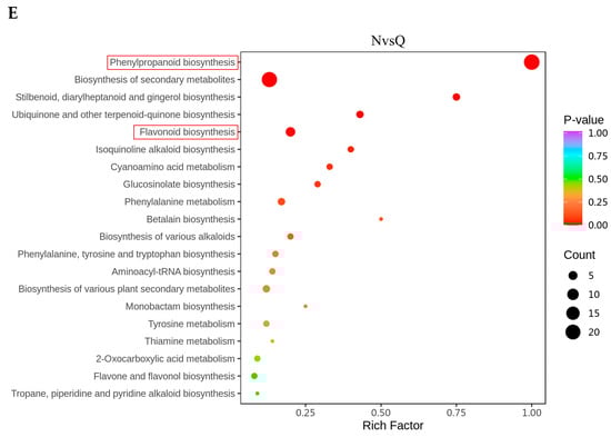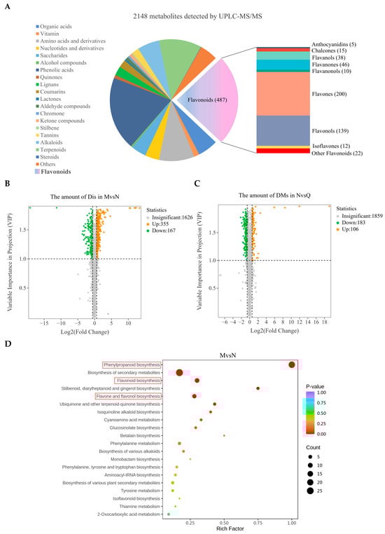 The findings from widely targeted metabolomics revealed 2148 R. chrysanthum metabolites in total. With 487 species, the majority of them were flavonoids and could be divided into nine main families (Figure 3A). Different metabolites (DMs) and different flavonoids (DFs) were screened according to variable importance in the projection (VIP) and fold change (FC) values. UV-B radiation (MvsN) resulted in 522 DMs (355 raised and 167 reduced) in R. chrysanthum, while exogenous ABA treatment (NvsQ) resulted in 289 DMs (183 raised and 106 reduced) (Figure 3B,C). KEGG enrichment analyses showed that post-UV-B, the DMs of R. chrysanthum were mainly enriched in phenylpropanoid biosynthesis, flavonoid biosynthesis, and flavone and flavonol biosynthesis, and the DMs after exogenous ABA treatment were similarly mainly concentrated in the phenylpropanoid biosynthesis and flavonoid biosynthesis (Figure 3D,E). This suggests that UV-B radiation activates phenylpropanoid biosynthesis in R. chrysanthum, while exogenous ABA modulates the phenylpropanoid biosynthesis pathway, thereby inducing a positive response to UV-B in R. chrysanthum.