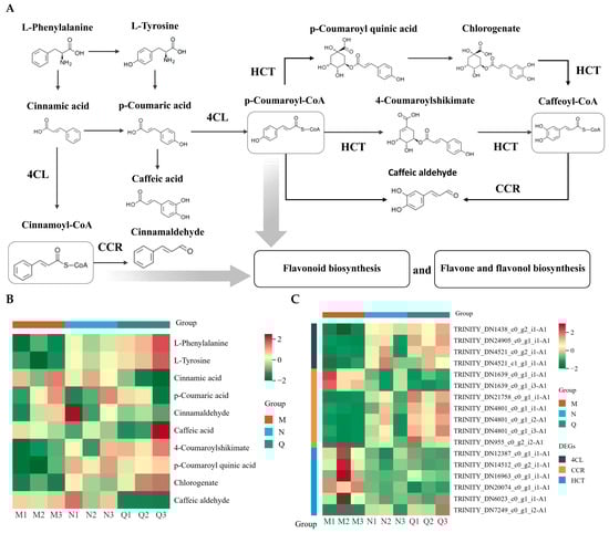 Two experimental treatments prompted reprogramming of the phenylpropanoid biosynthesis pathway in R. chrysanthum. Group M (PAR treated), group N (UV-B radiation treated), and group Q (exogenous ABA and UV-B treated) were the three groups being studied. (A) Simplified modeling of the phenylpropanoid biosynthesis pathway in R. chrysanthum. (B,C) Clustering heatmap of DMs and DEGs. The expression of DMs and DEGs involved in enzymes in the pathway is presented as a clustered heatmap; the higher the expression, the more reddish the color, and the lower the expression, the more greenish the color. From left to right, each of the adjacent three squares represents three biological replicates of each of the three comparison groups (M, N, and Q).
