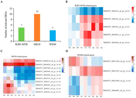 Dynamics of the MBW complex after two experimental treatments. (A) Quantitative statistics of MYB, bHLH, and WD40-associated DEGs in R. chrysanthum after two experimental treatments. (B–D) The heatmap of clustering of the expression of MYB, bHLH, and WD40-related DEGs.