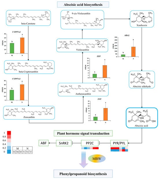 A simplified model of ABA biosynthesis and signal transduction in R. chrysanthum. The three biological duplicate experiments’ means are shown by the heights of the bar graphs (n = 3), and SDs of the three samples are shown by the error bars. Significant changes across data groups are indicated by different letter markers (p < 0.05). The expression of DEGs in the ABA signal transduction pathway is presented as a clustered heatmap; the higher the expression, the more reddish the color, and the lower the expression, the more bluish the color. From left to right, each of the adjacent three squares represents the respective three biological replicates of the two comparison groups, M and N, respectively.