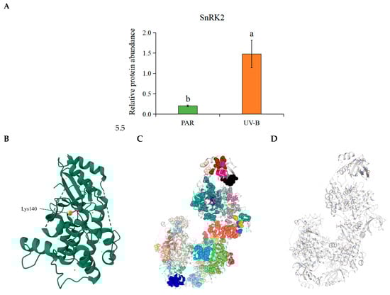 The results showed that lysine residue 140 of the SnRK2 protein in the ABA signal transduction pathway in R. chrysanthum underwent significant acetylation modification, and its expression was significantly increased after UV-B radiation treatment (Figure 7A). Based on this, a three-dimensional structure of SnRK2 was constructed in this experiment, and the acetylation site was labeled (Figure 7B).
