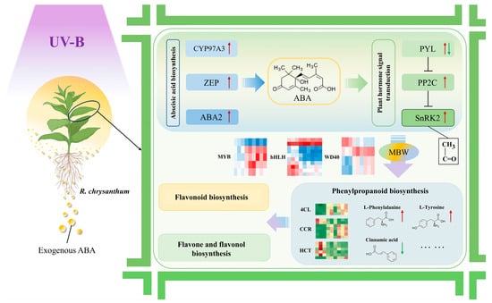 The research clarifies the crucial function of abscisic acid (ABA) in regulating R. chrysanthum’s adaptive reaction to UV-B stress. Our comprehensive multi-omics study shows that exogenous ABA can have important regulatory effects on the phenylpropanoid biosynthesis pathway, aiding the plant in adapting to the negative impacts of increased UV-B radiation (Figure 8).
