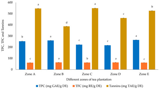 The tannin content also illustrated in Figure 1, and expressed in milligrams of TAE/g DE, showed that samples from Zone A, C, and E presented higher levels, with values of 546.36, 548.97, and 525.90 mg TAE/g DE, respectively, and lower levels were present in samples from Zone B, with 386.79 mg TAE/g DE. Yadav et al. [19] showed lower values for tannins in black tea samples (approximately 85 mg GAE/g DE). This difference may be related to differences in terms of the extraction/analysis methodologies used, as well as genetic differences, geographic location, processing, and storage conditions.