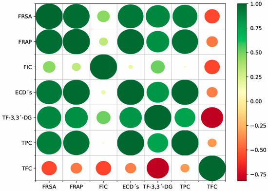 Correlation matrix of the studied parameters in Azorean Camellia sinensis black tea (Pearson’s correlation coefficients). FRSA, free radical scavenging activity; FIC, ferrous ion chelating; ECDs (epicatechin derivatives), sum of EGC, EC, EGCG, and ECG (epigallocatechin, epicatechin, epigallocatechin-gallate, and epicatechin-gallate); TF-3,3’-DG, theaflavin-3,3′-O-digallate; TPC, total phenolic content; TFC, total flavonoid content.