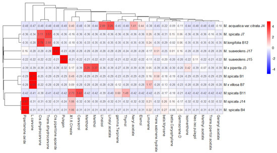 | Menthyl-acetate | 18.84 | 1291 | 1294 | 0.00 ± 0.00 | 0.00 ± 0.00 | 0.00 ± 0.00 | 0.00 ± 0.00 | 0.00 ± 0.00 | 0.00 ± 0.00 | 0.00 ± 0.00 | 2.90 ± 0.40 | 0.00 ± 0.00 | 0.00 ± 0.00 | 0.00 ± 0.00 |