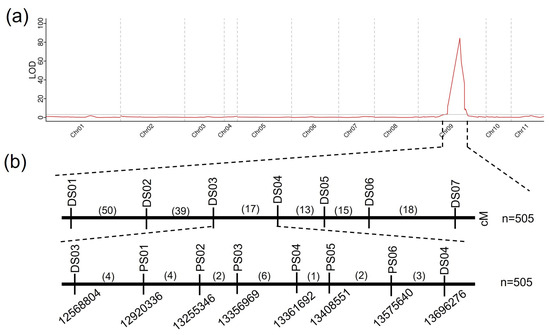 An SNP panel containing 198 SNPs and 15 InDels was developed as a preliminary map of the green rind locus. Initially, the SNP panel was used to genotype the F2 population, which consisted of 505 individuals resulting from the cross between CG058 and CG265. Composite interval mapping (CIM) was used for QTL analysis on the F2 population, as indicated by their phenotypic characteristics, using the WinQTLCart2.5 software [36]. To narrow the mapping interval (Chr09:97.8 to 166.12 Mb), seven InDel markers (DS01-DS07) were designed for each 0.4–1.8 Mb interval, as per the SNP density, and used to genotype the 505 F2 individuals. The recombinant plants were genotyped using six SNP markers (PS01-PS06), each with an average interval of 100 kb, to fine-map the green rind locus. The TransStart® FastPfu PCR SuperMix (TransGen Biotech, Beijing, China) was used for PCR amplification under the following conditions: step 1, 98 °C for 1 min; step 2, 98 °C for 10 s, 55–60 °C for 5 s, 72 °C for 30 s, (30–35 cycles); and step 3, 72 °C for 1 min. For the CAPS markers, the PCR product was digested with appropriate restriction endonucleases and separated by 1.0% agarose gels. The PCR product was separated via 8% gel electrophoresis (PAGE) for InDel markers. The sequences of the used markers are listed in Table S1.