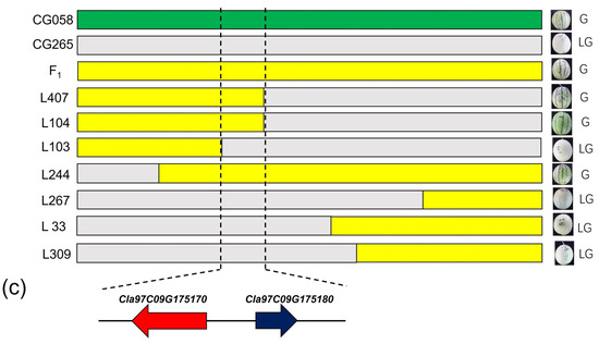 Cla97C09G175170 and Cla97C09G175180 are two possible genes that are present in the 110-kb region, as indicated by the annotation data of the reference genome 97103 (v2) (Figure 3c). A two-component response regulator-like protein, ClAPRR2, is encoded by Cla97C09G175170, whereas the function of Cla97C09G175180 is unknown.