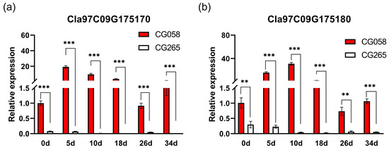 Detection of the expressions of potential genes from the parents. (a) Relative expression of Cla97C09G175170. (b) Relative expression of Cla97C09G175180. The rinds are represented by 0, 5, 10, 18, 26, and 34 d on the x-axis, indicating the days after pollination. Data are illustrated as means ± SE. ** = p < 0.01; *** = p < 0.001.