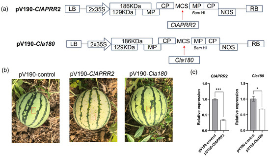 Phenotypic and gene expression of watermelon fruits infiltrated with VIGS constructs. (a) Maps of the pV190-ClAPRR2 and pV190-Cla180 vectors. (b) Variations in the phenotypes of fruits that were infiltrated with various VIGS constructs at 25 DAP. Infiltrated positions are indicated by red arrows. (c) Expression of ClAPRR2 and Cla180 in VIGS-treated rinds. Data are illustrated as means ± SE. * = p < 0.05; *** = p < 0.001.