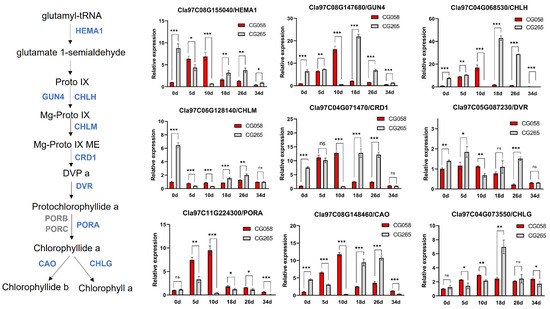 Comparative expression of the Chl synthesis pathway genes in both rind parents. The rinds are represented by 0, 5, 10, 18, 26, and 34 d on the x-axis, indicating the days after pollination. Data are illustrated as means ± SE. * = p < 0.05; ** = p < 0.01; *** = p < 0.001; ns = no significance.