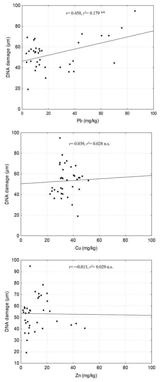 Relationship between metal concentration in leaf tissue of P. dulce and genotoxic damage. The graphs show the linear regressions to determine the relationship between Pb, Cu, and Zn concentration in leaves and the observed genotoxic damage. The values of the linear regressions are indicated at the top of each graph. n.s. = not significant, ** = p < 0.01.