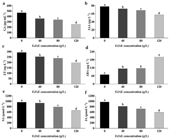 2.4. Allelopathic Effects of EJAE on Phytohormone Homeostasis in A. hookeri Seedlings