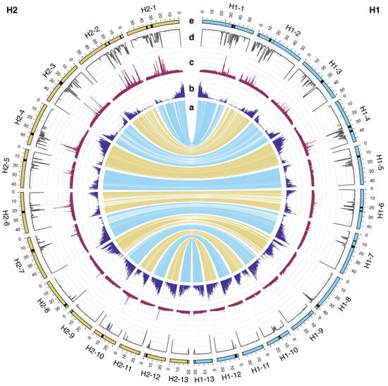 Haplotype-resolved assembly of a female Urtica dioica ssp. dioica individual (2n = 26). The two haplotypes are compared (H1 on the right, blue; H2 on the left, yellow). The tracks in the Circos plot represent (a) aligned regions between haplotypes, (b) gene density, (c) TE density, (d) repeats, Shannon diversity score, and (e) predicted centromeric regions, highlighted in black on the ideogram.