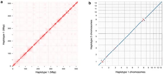 We also observed fragmented alignments between haplotypes in regions with low gene density and high repetitiveness in several chromosomes (compare panels a–d in Figure 1). Across all 13 chromosomes, SyRI classified only about 71% of the regions between the two haplotypes as syntenic, with around 16% of the genome remaining unaligned (Table S5) due to their extremely repetitive content (see below). While it is not possible to completely exclude that some of these patterns are due to artifacts in sequencing or assembly, these results highlight a high occurrence of structural variation in the stinging nettle genome (Figure 1a, Figure 2b and Figure S2). Structural variation between haplotypes, especially if they have been maintained in nettle for many generations, could also contribute to the high level of estimated heterozygosity (~1.5%), which was obtained from short read sequence data from the same stinging nettle individual and was therefore determined independently from the genome assembly. While the report of such extensive structural variation in the genome of nettle is novel, the importance of SVs in maintaining sequence and functional diversity in wild [20] and cultivated species [21] is being increasingly recognized. Given the wide range of ecosystems in which stinging nettles grow [2], it is tempting to speculate that these SVs could be involved in adaptation to particular environments, as is the case in other systems [22,23]. However, additional experimental evidence and species-wide genetic and phenotypic analyses will be required to assess the adaptive relevance of SVs in nettle.