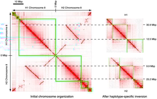 The 18.4 Mbp inversion found between haplotypes on chromosome 8 is supported by Hi-C data. In the left panel, Hi-C data are aligned to both haplotypes simultaneously to create a haplotype-aware heatmap. Green lines represent contigs. Only the section of the genome-wide haplotype-aware heatmap corresponding to chromosome 8 is shown; top left contigs correspond to the H1 and bottom right contigs correspond to the H2 versions of chromosome 8. The right panel shows changes in the contact map when Hi-C reads are mapped to modified versions of the assembly, in which the orientation of the large putative inversion on chromosome 8 is flipped in H1 (top) or H2 (bottom). Disruption of (haplotype-aware) Hi-C patterns in both of these cases supports the presence of opposite orientations of the inversion in the two haplotypes.