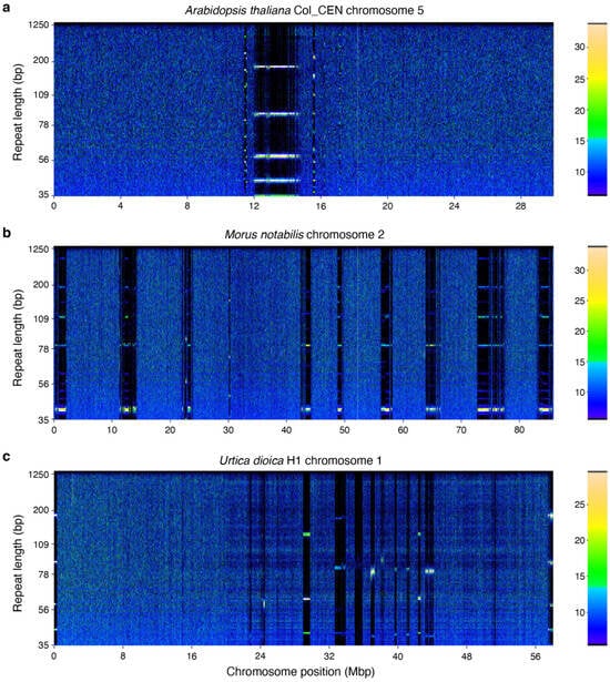 Fourier transform spectra of repeats occurrence in (a) Arabidopsis thaliana chromosome 5 with metacentric centromeric signal; (b) Morus notabilis chromosome 2, representative of a holocentric chromosome (Elphinstone et al., 2023 [26]); and (c) U. dioica ssp. dioica chromosome 1 (this study). Colour intensity corresponds to the number of times a specific repeat is found in a 5 kbp window. Bright horizontal lines indicate presence of a repeat sequence that repeats itself many times across that region of the chromosome, such as tandem repeats found in telomeric and centromeric regions. Multiple bands in those regions represent harmonics of the base repeat sequence.