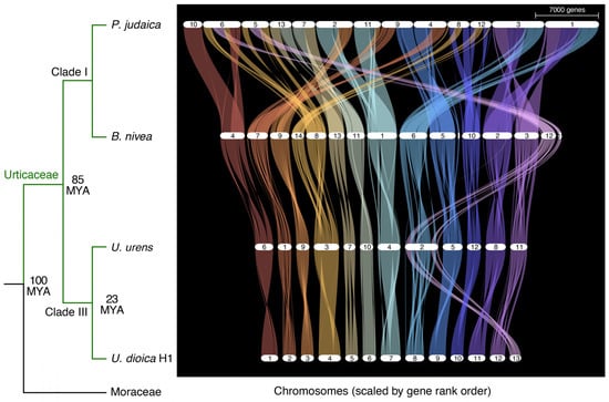The haploid chromosome number of U. dioica has been variously reported to be 12 or 13 chromosomes [30]. In this study, we unequivocally identify 13 separate chromosomes in the U. dioica genome assembly. However, base chromosome number is highly variable within the Urticaceae (ranging from 7 to 14 [31]), as well as within Urtica species [32]. While the Urticaceae family has a complex phylogeny, multiple sources support a monophyletic origin and subdivision in four clades (I-IV [33,34]). The divergence time between clades II/III and clades I/IV was estimated to be 84.87 million years, and the Urticaceae family split from the nearest relative Moraceae 100.01 million years ago [33]. To understand the evolution of genome organization in this family, we compared our U. dioica (clade III) genome assembly to those of three other species in the Urticaceae: Urtica urens (clade III), Boehmeria nivea (clade I), and Parietaria judaica (clade I). Despite evidence of abundant large-scale chromosome rearrangements, we found synteny to be quite conserved across all of these species (Figure 5).
