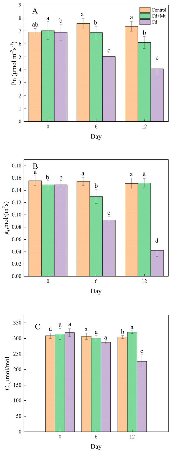 The gas exchange process in plant leaves is fundamental to plant physiology, influencing growth, environmental adaptation, and ecosystem functionality. As illustrated in Figure 2A, with prolonged treatment time, the net photosynthetic rate (Pn) of R. simsii leaves in both the CdMT and Cd treatment groups showed a sustained decrease relative to the control treatment group. By the 12th day, Pn values in the CdMT and Cd treatments were reduced by 13.0% and 40.7%, respectively, highlighting a substantially greater down-regulation in the Cd treatment group. Furthermore, Figure 2B demonstrates that stomatal conductance (Gs) in the Cd treatment group declined sharply over time, showing reductions of 36.7% and 71.6% on the 6th and 12th days, respectively. In contrast, the CdMT treatment exhibited a nonlinear response, with an initial decrease followed by partial recovery; while Gs was significantly reduced by day 6, it recovered to levels nearly comparable to the control by day 12. This pattern aligns with intercellular carbon dioxide concentration (Ci) trends shown in Figure 2C, where Ci dynamics mirrored those of stomatal conductance across treatments. These findings suggest that exogenous MT application in the CdMT treatment mitigated Cd-induced stress, resulting in less severe physiological damage to the leaves compared to the Cd-only treatment. This protective effect of MT is evident through the improved maintenance of gas exchange parameters, especially in the later stages of exposure.