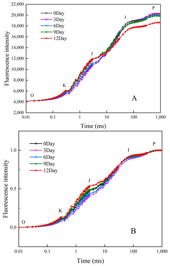 Chlorophyll fluorescence kinetics curves (A) and standardized chlorophyll fluorescence curves (B) for R. simsii leaves under cadmium stress. The letters O, K, J, I and P refer to the selected time points used by the JIP test for the calculation of structural and functional parameters.