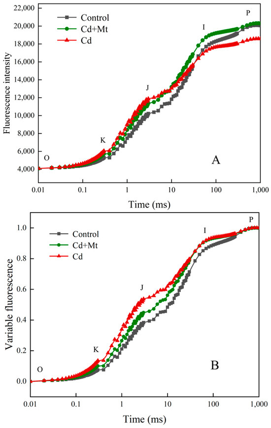 Chlorophyll fluorescence kinetics curves (A) and standardized chlorophyll fluorescence curves (B) for R. simsii leaves after 12 days under cadmium stress with the application of exogenous MT.